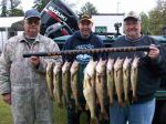 Today's 1/2 day trip had to be the ugliest day Kenneth has spent on the water in a long, long time. Boat control was a disaster with strong northeast winds, and the cold rain didn't feel too good dripping down the guys backs either. They left the Gladstone Yacht Harbor shortly after 6:30 a.m. and headed to the north end. Fortunately Kenneth had a couple of great guys along willing to help run all the lines, etc. They certainly didn't knock em' dead today, but the guys did end up with a nice limit of fish for the camp fish fry. All of their fish came on Walleyes Choice (http://www.walleyeschoice.com) harnesses trolled behind bottom bouncers. They tried a variety of colors today, but I-48, I-42, I-79, and I-76 were the best. They caught several fish suspended today, and they had several nice fish come un-buttoned. Bite was subtle again, with most fish just barely hanging on, not pulling the board back at all, they had to feed it to them a little before tightening up to the fish. By the time our 5 hrs was up the wind was really kicking up it's heels, and trying to go .8 to .9 mph was getting a little tough, even with drift socks out to slow our troll. Here's a picture of today's fish along with a little video as well. Weather permitting, Kenneth will be back at it again tomorrow, good luck from all of us in the Bay de Noc area.