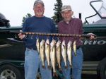 Gotta make this a quick report, need some shut-eye before tomorrow morning. We couldn't get out this morning because of the storms and strong winds, so we made today's trip an afternoon adventure. We still had a little bit more wind than I'd have liked, but we didn't mind because the fish were biting great. The only bad thing was that out of at least 50 walleyes caught today, we only managed 6 keepers and a couple of eater perch. Tons and tons of throwbacks today. All fish were caught pitching 1/4 oz. jigs and crawler halves. We had to put up with some doofus traffic too messing it up a bit, but that's expected on the weekends. Overall we had a very fun day on the water. Here's today's catch, good luck from all of us in the Bay de Noc area.