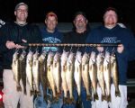 What a beautiful afternoon on the water yesterday. Mickey, Tim and Matt were back out with me for a short 5hr trip. We left the Esky harbor around 4:30 and headed north a ways. We started casting spinnerbaits for pike, but quickly realized they were not active at all with the bright conditions. We then got switched over to the walleye mode and headed to a spot a little closer than where we fished Wednesday. From 6:30 until 8:30 p.m. we could not keep all the lines in the water. We had doubles, triples, and had two fish on when we were pulling lines in and getting ready to head in. It was some of the most fun and hectic fishing I've had in a while, the guys called it "quite a workout". In all, we had about 25 fish hooked and the guys kept 15. All fish came while trolling WalleyesChoice (http://www.walleyeschoice.com) harnesses. I'll have to post the colors later because we were using some colors I haven't used in a while and I'm not sure of the numbers. We came in just after the sun went over the horizon and the full moon was coming up. With such a beautiful night I was surprised to only see two boats on the water and the closest one was over a mile away from our location. Here's a picture of our catch...good luck from all of us in the Bay de Noc area.