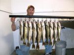 My brother Kenneth had Steve Malloy and his dad Jack on board for a 5 hour trip this afternoon. The high winds really limited what he could do presentation wise. I think he ended up getting the drift socks out and drifting the breaks with Lindy Rigs. He headed for home pretty quick since he has another trip in the morning. Here is a picture of the 10 fish they brought back today. Good luck on the water folks...