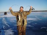 Been hearing better reports from guys fishing off the breaks, ( I normally like to set up at the base of a breakline.) Tried tonight about 50 yards off a break, in about 35 FOW. Actually had a pretty decent trip. It was a refreshing change of pace to have the majority of fish that came through actually bite! Landed 9 walleyes tonight, with four of them being legal fish between 15 1/2 and 19 inches. All on jigs - no action on the tip-ups, (one of my minnows did get chewed up pretty good without tripping the flag, though.) I did mark three big fish tonight, but they were the only ones that didn't want to play.