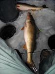 Went out today south of Gladstone and had pretty good luck. At about 6:35, a fish comes in and smokes a #9 firetiger. After a pretty good battle, I landed the fish, a 27" eye. The fish inhaled the bait and was bleeding bad. I decided rather than wasting the fish, I would keep it. Here is where it gets fun. 5 minutes later, a TANK smokes the number nine. After about a 5 minute battle, I get her to the ice. She is freekin 33" long. Weighed her on the digital at 12.1 lbs (was bouncing to 12.6). Shiiiittttttttt, back she goes, guess I saved a few bucks on taxidermy. Ended up with a limit, the other fish under 19". Oh well.... Sorry bout the crappy pic but with that wind tonight, I was afraid to stand up for fear of blowing away.