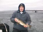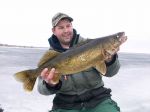 Well, this evening might have been my last day on the ice this season as the ice is going quick!!! If it gets close to 60 degrees tomorrow like they are forcasting, what's left will really go quick. That said, my brother Kenneth, longtime guest (and now good friend) Joe Volpe, good friend Gary Daniels "aka walleyeguy", and Gary's friend Steve gave it a go this evening. Kenneth started it off with a really nice fish while jigging that was 26-27 inches which he quickly released, then Steve landed one about 22 inches on a tip-up, then Joe caught a nice eater. After that it was getting too dark for video. To sum it up, Kenneth caught the one nice one plus one more eater, Steve ended up with 3 eaters, Gary with two eaters, and Joe and I with just one eater a piece. A few throwbacks were caught, but not that many. We did not have nearly as many fish come through as we did earlier in the week. And the ones that did come through, did not seem very active. So all told, 8 eaters and one big one released. If anyone is still planning on going out the last two days of the season, be extra cautious as I can't believe how much ice we have lost just in the last two days!!!