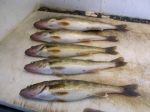 Today's half day trip was spent fishing with Rick and Darrell, a couple of great guys that come up and stay with us every June.  Rick gets the trip from his kids for Christmas each year, and the past couple of years we've had some pretty good fishing.  Today, however, the north winds cleared up a lot of the dirty water I've been fishing the past couple of weeks and the fishing was tough because of it.  After catching a few small walleye, one keeper, a pike and a couple of sheepshead pitching jigs/crawlers...we made a move south to troll Walleyes Choice (http://www.walleyeschoice.com) crawler harnesses in some darker water down by Escanaba.  We managed two keepers doing that and then the northeast winds were making boat control tough so we headed up the Escanaba River for the last hour of the trip.  We managed to pull two more keepers and several undersized walleyes before it was time to head in around noon.  Not the greatest morning of fishing, but we did get enough fish so the guys can have a pretty good fish fry one of these nights.  I think they were happy to find another spot to fish when the weather gets too bad to be on the bay.  Here's a picture of today's catch, some nice chunky fish, one of which would have been real nice to have in yesterday's tourney.  Instead of finishing 2nd, my partner and I would have come real close to winning.