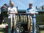 Today's 5 hour trip started out pretty slow as it was dead calm on the bay with thick fog. After a couple hours the fog finally cleared and the wind started up. The wind turned the fish on almost immediately. Kenneth and his client ended up with 4 really nice pike ( the largest about 40 inches) and 6 "eater" walleye. All in all, much better than yesterday. The water temp. has come back up to 65 degrees too. Good luck on the water folks...