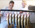 Today I had the chance to get my 4 yr. old son Cameron on the bay for some walleye action. The bite has been awesome the past few days so I figured it would be a great time to get him interested in fishing the "big water". He loved the boat ride out and before we could get all the lines in the water we had fish on. I planned on running six lines, however the bite was so fast and furious that it was hard to keep 4 lines going. In the hour and a half we were out we landed 8 keepers, let many small fish go, and lost some decent fish as well. All the fish came using bottom bouncers and crawler harnesses behind planer-boards in 12 to 17 fow. We would have stayed out to get two more for our limit, but the back and forth wave action had his little tummy feeling a little queezy...so we headed in. Here's some pictures of our awesome father/son trip today! I sure am proud of my little guy!!! Now if I could only get my tournament partner to fish that good. LOL