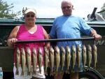 Today's short 5 hr. trip with Gary and Julie from downstate Rockford Michigan started out on the bumby side. We ventured out of the Escanaba Harbor around 7:30 a.m. and the wind was already blowing pretty good from the south/southwest. We had to do a lot of sorting this morning, but we eventually got our 15 "eaters". We were trolling with Walleyes Choice (http://www.walleyeschoice.com) bottom bouncers and crawler harnesses at 1 mph. At times it was pretty fast and furious and at one point we had 6 fish on at once. We had three in the bottom of the boat, they were each fighting one, and we still had one line in the water with a fish on it. We didn't get any big fish today, but there was definitely plenty of action. I thought that with the wind blowing we'd get into some larger fish like we were getting a week or so ago, but I guess it wasn't meant to be. There's been some pretty good mayfly hatches in the upper bay recently, but I haven't seen any alewives in the upper bay recently. We had a water temperature of 74 degrees. Here's a picture of today's catch, good luck from all of us in the Bay de Noc area.