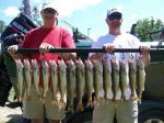 Today's 1/2 day trip was with Bill and Brad, a couple of Iraq War veterans that are up here as part of a military band that's traveling around playing concerts throughout the area. The other day they played up at Munising, tonight they will be at the bandshell in Escanaba. We started fishing around 7 a.m. and had a nice 15 fish limit by 10:30 a.m.,. We then made one more pass and upgraded a few fish before heading in around noon. It was a fun morning with a couple of great guys. Most of the fish were 15 to 17 inchers, but on our last pass we did get a couple of 19 inchers that put up such a fight in the 75 degree water I thought maybe we had sheepshead on. It's been a great bite lately with the warm weather and warm water. Walleyes Choice (http://www.walleyeschoice.com) harnesses trolled behind bottom bouncers did the trick again. I-51 was fantastic as well as a new one that I'm not even sure of the number yet. I was worried that the bite might not be as good after that strong front that passed through and all the lightning we had, but the fish were still hungry and we had a great time! Here's a picture of today's catch, that Bill is going to fry up for the guys tonight. Good luck from all of us in the Bay de Noc area.