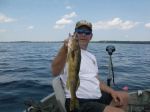 Theresa and I started off casting for pike this evening. Probably shouldn't have spent so much time on the pike since we could not get a single northern to rise for over an hour and a half! Finally switched over to trolling for walleye using my brother's new in-line spinners and caught a 14 1/2 incher right off the bat. Then another about 18 inches. Then the wind started blowing from the north and we could not catch another walleye to save our lives. We did catch a couple perch we could have kept (hindsight wishes I would have now). Since the wind started blowing and we weren't going to fish much longer anyway, we switched back to fishing for northerns trolling the old Johnson silver minnows up through the weeds on center reef while heading back to the launch. Only caught one little bugger. I have never seen the weeds so thick on center reef. Sure was nice out there until the wind came up. And it definately beats working!
