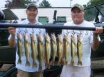 Today's trip was with Dale DeWildt from Appleton Wisconsin. I had a great trip with Dale and his son back on opening day. We let some rain showers pass by early this morning, then headed out on the bay. It's been a great bite lately and today was no exception. It started out good, slowed some, then when the wind started to blow a little it was "game on". The last hour and a half of our trip we could not keep 6 lines in the water. At one point we caught 8 fish within ten minutes with only half our lines out. It was fast and furious to say the least. Lots of little fish today again, which is great for the future, but we did catch somewhere between 25 to 30 keepers too. It was really fun for me because usually the clients get to catch the fish...but when they bite like they did today I got to catch a lot of them too. For the last 45 minutes we decided to put away the trolling gear and we drifted through the huge school of fish with floating jigs tipped with 1/2 crawlers for some hands-on fun and we actually caught some larger fish than what we already had in the livewell, but they were released because I don't like to do much culling when the water temperature is 75 degrees. I-51 was the hot Walleyes Choice (http://www.walleyeschoice.com) crawler harness as well as a bright chartreuse #4 colorado blade. With all the undersized fish released, we easily caught close to 50 walleyes this morning. Here's a picture of Dales mess of nice "eaters" to take back and enjoy with his gal Betty. Good luck from all of us in the Bay de Noc area.