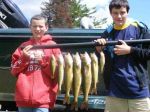 Today's trip was with some great guys from the Crystal Falls area. 14 yr. old Nicholas and 16 yr. old Noah along with their dads came over for a day on the bay. I was a little worried that the bite would be tough with the northwest winds and post cold front conditions, and tough it was. We started out in the "black bottom" area and caught a couple keepers there and some undersized walleyes, then it got real tough. We headed up to the north end to try some shallow weeds, and the fish were there, and some nice ones too. We caught a pair of 22's and a 20 incher, a sheepshead, and a small northern before that bite slowed. We then put the trolling gear away and headed back south to drift a breakline I've been getting some nice fish lately, but the fish did not want to cooperate. We ended up only getting 5 keepers today. It looks like the weather will be getting better for the weekend and some south winds should get things cranking again. Here's a picture of today's kept fish, good luck from all of us in the Bay de Noc area.