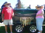 Today I shared the boat with Will and Gloria from Neighboring Canada for a short 5 hr. a.m. trip. They are on their way to visit relatives in Sarnia Ontario before heading back to their home near Calgary Alberta. We got on the water around 6:30 and headed back to the spot we did well on Thursday. We started out good with a couple nice keepers within the first 10 minutes of the morning, then we hit a dry spell and were only catching undersized fish and pesky perch. After a short stop at another location (where we caught only undersized fish as well) we went back to the deep water location we fished Thursday. Slowly but surely we started to get a few fish, and lose fish too!!! I'm not sure why we lost so many fish today...it was very frustrating!!! I guess we only ended up with 6 keeper walleye from 16 to 22 inches and some perch. I probably should have tried some different colors, depths, etc., but it's hard to go away from what worked so well just two days ago. Here's a picture of today's kept fish, we'll be back out there tomorrow. Unfortunately they're calling for a west wind...the absolute worst wind for fishing out here. Good luck from all of us in the Bay de Noc area.