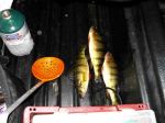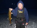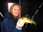 Got to the ice yesterday and just about turned around after seeing how windy it was. But we decided to give it a go. Was going to try at the base of a drop-off I haven't fished for sevral years, but someone had their shanty there. Not neing one to crowd someone, we moved out to basically in the middle of nowhere. Well, "nowhere" was not good for walleye as we didn't do squat for walleye. But there were some real nice perch. Even though we didn't really have anything to use for the perch, we did manage to pick off 3 of the stupid ones (10 1/2 incher plus two 11 1/2 inchers). Caught one a tip-up, and two on jigging raps. Today we went to try another spot we haven't fished for years and again found a shanty sitting right on top of where I wanted to be, but that's fishing. So we quickly picked out another spot to try. Checked some depths and liked what we found. Came prepared today for the perch and brought a few waxworms to try (which we left in the truck!). We got a late start though and I didn't really want to take the time to go back for them. So we quickly set a couple tip-ups and started jigging. Once again, there were perch as soon as we got our lines down and Theresa caught a small one right away. They would not leave one of the tip-ups alone either. I don't know how many times we reset that one tip-up. But we could only manage the one perch today. They were there until just before dark, then left. Just as we were getting ready to leave we had a flag and Theresa pulled up a nice walleye that went 20 inches on the nose and we came home. I will be fixing up a couple rods just for perch before going again. Haven't heard a good report on walleye for several days now, hope someone is catching a few...
