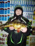 Paul Viau stopped by the shop Saturday afternoon with his uncle with a 15 inch, 1 pound 10 ounce perch. His uncle said Paul was the hot stick that trip, landing several 11 inch perch, a couple 13 inchers, and the 15 inch, (biggest one he caught that trip was 11 inches.) They were fishing with teardrop jigs tipped with small minnows on "one of the three reefs" in the upper bay.