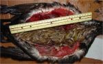 They shot this cormorant while either goose or duck hunting near the Saginaw Bay. They took it home and cut it open to look at its stomach contents. Look at all the perch in its belly, and this is just one cormorant!