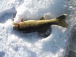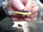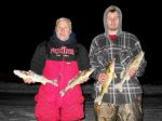 We had a pretty good evenings fishing tonight. Could have had a little less wind though since we were just sitting outside on buckets. Anyway, I was fishing with guest Joe Volpe, his son Brandon, and my brother Kenneth. My brother limited out (what a putz!). Joe and Brandon caught 4, and I caught 3. So 12 walleye total. They were all just good eaters with the exception of a nice 24 inch male. Right after landing the big male, I hooked another really good fish, but it came off! Oh well, that's part of fishing too. My brother hooked his first walleye on an Ice Darter that he painted up like a blueberry muffin with a purple top and a chartreuse bottom. I know Kenneth caught some on Firetiger too. I think Joe and Brando caught all theirs on Firetiger as well. I caught my three on the #9 Glow Jigging Rap. All in all, a very nice evening on the ice...
