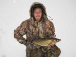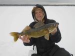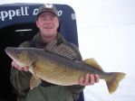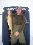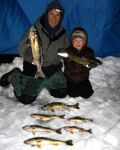 Wah, I don't know where to start. I guess I'll start with me since I was the first one to catch my limit! We got on the ice around 3:00 and by 5:00 I had my limit of walleye (a rare occurance). I was jigging 6 feet off bottom in 30 feet of water. I caught a couple on the #9 Glow Hot Perch and the other three on the #9 Glow Jiggin' Rap. After landing my 5th legal, which also happened to be my biggest today, I walked over to good friend Jim McDonald to have him take a picture. While there, he caught his first keeper. His brother John had a couple eaters by now. I then walked over to see my brother Kenneth and his 5 year old son Cameron and was surprised to see that Cameron was outfishing my brother. Cameron ended up with 4 walleye and a nice perch. Kenneth ended up with 2 walleye and a nice perch. Then I walked a little further to see guests Joe Volpe and his son Brandon. Just as I got there, Brandon hooked the twin to my 22 1/2 incher. Both fish were really fat for there size. Joe and Brandon ended up with 7 walleye between them. Ditto for Jim and his brother as they also ended up with 7 keepers total with John catching his limit. John also released a hog and hopefully he can add a picture to this post when he gets home. If I counted right, that's 25 walleye this evening between us all (plus I think John released 4 keepers). And to think my brother wanted to go fish bluegills today...