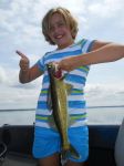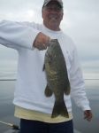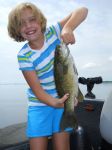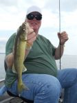Today's trip started out a little on the chilly side and my clients were actually cold for a while. The wind wasn't quite right for what I initially wanted to so, so we went with plan B and headed to the north end where we got some fish on Friday's trip. After two hrs. of trolling bottom bouncers and harnesses with only one nice fish and several throwbacks...we made a move and decided to get out the jigs. The cool wind quit...and it actually got pretty hot out there. With flat calm conditions, the water temperature finally started to heat up a bit and the fish got active. The water temp. at the north end went from 79 down to 70 after yesterday's north wind, but we found some 75 degree water and the bite was on!!! Between 11 a.m. and 2:30 p.m. we caught 20-25 walleyes and some really nice smallies (which they wanted to keep). We ended up keeping 17 walleyes and the three bass. 11 year old Rachel had a hot hand and is one great fisher-gal. Here's a few pics of today's day on the bay. Good luck from all of us in the Bay de Noc area.