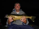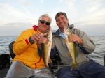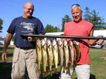 My brother Kenneth and longtime clients Jim Lewinski Sr. and Jim Lewinski Jr. started out the day drifting the breaklines with Lindy Rigs. That produced zip! They hit several spots but nothing happening there. They finally ended up getting the boards and spinners out for the last 3 hours of the day and ended up with 5 "quality" sized walleye. Guests Joe Volpe and Rick Palasek were working the weeds and reefs yesterday and ended up with 9 nice eaters (sorry, no picture). They went back to the same program today and caught 8 more (picture). The average size was much bigger today though. Joe said "if you were not in the weeds, you were not catching fish". Here's a couple pictures of big and little Jim from yesterdays trip (and video) and a picture of the walleye Joe and Rick caught today.