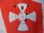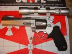 Hunting season is coming fast so I thought I better get my handgun sighted in. If you have never used a handgun for hunting you should try it It is awesome. Here are a few pics of my sighting in today. The revolver in the pic is a Taurus Raging Bull in a 44 magnum. The scope is a 2x6 Bushnell. The target was at 50 yards. The last pic was 50 yards also doing rapid fire.There are six shots in each target.