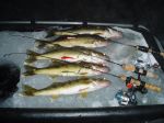 Fished Little Bay the other day for walleye. Got set up around 2:00 and jigged for 10 or 15 minutes and got a nice one on. I had it right at the edge of the hole and it got off. The last hour before dark the Vexilar was showing me lots of fish. I had a flag go up on one of my new tip ups I got for Xmass. It was a 15 incher that I hade to keep. A half hour before dark I jigged up 3 more that I iced. It was a pretty good trip. Oh ya...I threw one back and lost 3 more.