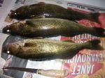 Fished in a new spot tonight with good friend Ray. We didn't really start marking fish until after 5:30. Only had a few walleye bites, all jigging. Ray did release a nice pike caught on a tip-up. Overall the fishing was pretty poor tonight. I would have had a couple more if it wouldn't have been for some operator error! It was so warm out I just fished outside hopping from hole to hole. Right at dark I had a nice fish come in, and at the same time the wind blew my line around a piece of ice...well, you can imagine what happened. The fish shot up and hit my bait and I missed him as I was trying to clear my line from the ice...timing is everything!!! The fish we did get were nice fat healthy fish. I might have to get out the airbrush and do some painting of some baits, the fish have been puking out very small gobies. It was still nice to be out there and not have a soul within 1/2 mile or so. The bite will pick up once we get some nice stable high pressure for a couple days. Good luck from all of us in the Bay de Noc area.