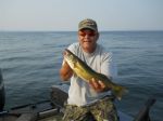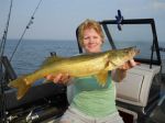 I'm in a pissy mood right now. I don't mind a couple nice fish coming unhooked, but losing 5 really ticks me off . My wife Theresa and I fished today from 2:00 until about 7:00 this evening and ended up landing 3 nice walleye that were 20, 20 1/2, and 24 inches. Still, we should have had 8!!! I have no idea why we couldn't keep them on the line. I made a few casts for pike on the way in and had two misses and landed one. The first walleye came on the outside board which had gotten up into about 12 feet of water. We decided to drop the boards and try and follow the contour of the drop off and just hand hold the rods. The fish were really relating to the weeds along the drop off. It worked really good, we just could not keep the hooks in them. Theresa was excited because we were catching the fish on a hatchet blade she picked up down in Green Bay. I'll try and get a picture of it tomorrow and post it because it was easily the best color today. I think it's very similar to Walleye's Choice I-80 if I remember correctly. Time for bed, good night folks...