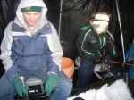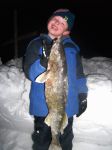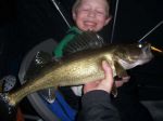 Well, today was the last day of walleye season and my neighbor Ted and I finally got our boys out on the bay for some jigging. Cam got off the school bus and was excited to head out to try our luck. The north wind was blowing hard, and it was actually kind of cold, but that didn't stop the boys at all. We took our time getting out, as the bite hasn't really started until around 7 the last few days. We were all set up by about 6 p.m. and I was hoping that after marking so many fish yesterday that the bite might improve. Boy was I wrong...we marked very few fish and the ones that did come through were very sluggish and stayed pretty close to bottom. We had one little flurry of action when I missed two fish on a #9 parrot, then we had a nice fish under us for what seemed like 10 minutes, but it wouldn't budge. Then...like it was meant to be, cam gave a jig, up came the fish...and Cam said, "I got him". His pole doubled over and the battle was on. The fish slid up through the hole and I couldn't have been prouder of my little guy. He was so excited that he did it all by himself, and such a nice fish too. This was his biggest fish so far while jigging, and he sure was happy. Hooked for life I hope. He said ice fishing is his new favorite way to fish. That was it, only one fish, but it was a great way to end the season!