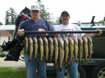 Well, it was day two with Ivan and Kevin today.  We went with the old saying, "you never leave fish to find fish".  So...we went back to our weedline, got out the jigs, and on our first drift along the weedline, snap-jigging 1/4 oz. chartreuse leadheads tipped with crawler halves, we landed 8 keepers.  The 2nd drift was not as productive...as some boat traffic was in the area spooking the fish.  It still amazes me that people think they can drive over fish in shallow water and think they're going to bite.  Hint...the last thing you want to do is drive over the fish you're trying to catch.  After a little lull in the action the fish starting biting again, and from 11 until noon we filled out our limit and released some as well.  It was kind of crazy at the end of the day...I was counting fish and the guys were still catching them.  I was trying to keep track of how many we had in the livewell and ended up throwing two keepers away that we should have kept...OOOOPS!  Oh well...it didn't matter, we had a great morning of fishing, lots of fun, and that's what it's all about.  Good luck from all of us in the Bay de Noc area.