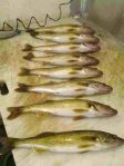 Yesterday's 1/2 day morning trip was with Charlie from Florida, and Bob and Gladys from North Carolina. They are all up here for a camping get together at the fairgrounds. We got on the water around 7 a.m., and decided to try the "hands-on" approach. We casted 1/4 oz. chartreuse jigs tipped with 1/2 a crawler in 7 to 10 feet of water along a weedline. We managed 2 keepers in the first hour, but then decided to try trolling for a while. We went up north where we've been catching fish the past few weeks trolling crawler harnesses, but that bite was non-existent yesterday. We tried 3 different spots, but the fish were not biting. We then went back to our jigging presentation for the last hour of the trip and ended up getting 6 more keepers and some undersized fish. I thought the bite would have been much better yesterday after the strong south wind we had on Wednesday afternoon. The water was clearing up quite a bit before we came in, and we could actually see groups of walleyes swimming along the weeds.