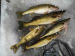 Ray and I hit the ice again today on our day off and it wasn't too bad. We got on the ice just at daylight and planned on fishing the whole day. We decided to go back to our deep water spot from last week and see if the fish were still there. While I was setting up my shanty I had my first flag of the day, so that pretty much gave us our answer. The spool was spinning pretty good when I got to it, but just as I went to set the hook the fish dropped it. Then there was a pretty good lull in the action except for a couple more flags and drops and some small pike and one 17 1/2 inch keeper I got jigging. My best bite came from noon until 2 p.m. During this two hour span I landed one keeper walleye on a tip-up, and 3 more jigging to go with the keeper I caught jigging earlier in the morning...and that filled out my limit, so by 2 p.m. I was done. My fish were 17.5, two at 18, a 19.5 and a 22. It just so happened that the moon came up about then...and the bite pretty much died. We had some more pike on tip-ups but that was it. I had to leave a little early, and headed in shortly after 4, but Ray said the rest of the evening was slow. Ray got one keeper jigging and some pike on tip-ups and lost 4 decent fish jigging. I've noticed the same thing while in the boat, when the sun and the moon are out at the same time it seems like the bite slows and that's exactly what it did for us today, at least where we were. Every fish I caught jigging today was on a #9 parrot jigging Rap. Tried several other sizes and colors...but that was the one they wanted. Good luck from all of us in the Bay de Noc area!